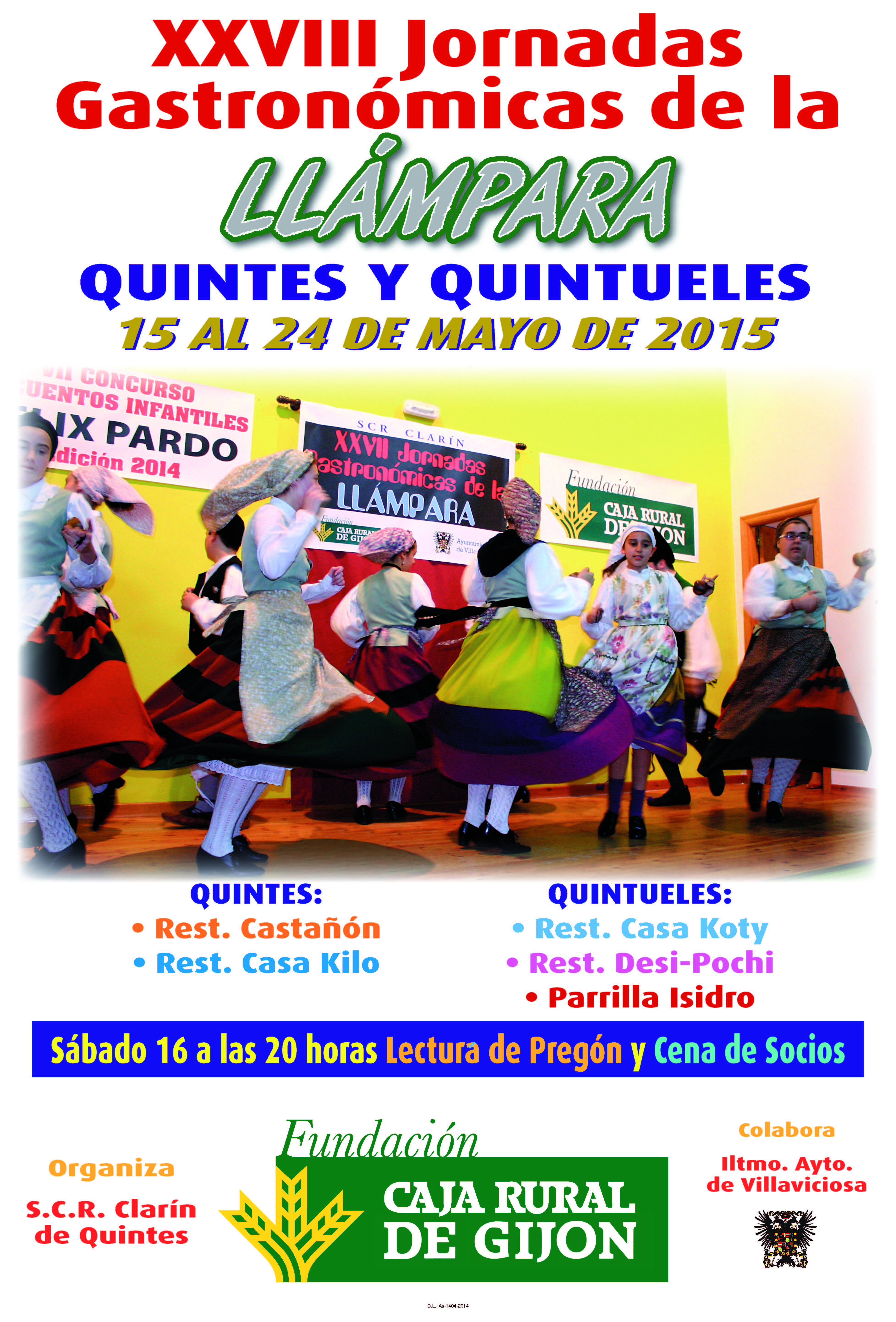 -20,00 horas- Acto de lectura del Pregón a cargo del escultor maliayo Pablo Maojo, a continuación bailes regionales a cargo del grupo Les Xanines de Quintes, finalizando con una cena para los socios de la S.C.R. Clarín en nuestro local social. Retirada de invitaciones de socios en el kiosco “La Carbayera” (Solo se podrá acceder a la cena de socios con invitación, se retirarán gratuitamente desde el miércoles 6 hasta el jueves 15 de mayo).