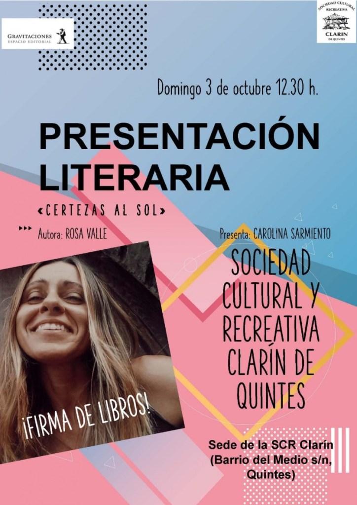 El próximo domingo 3 de octubre, en la sede de la SCR Clarín de Quintes, (Villaviciosa) a las 12:30, la escritora Rosa Valle presentará su poemario «Certezas al sol», publicado por la editorial Gravitaciones. Será presentada por la escritora y periodista Carolina Sarmiento.