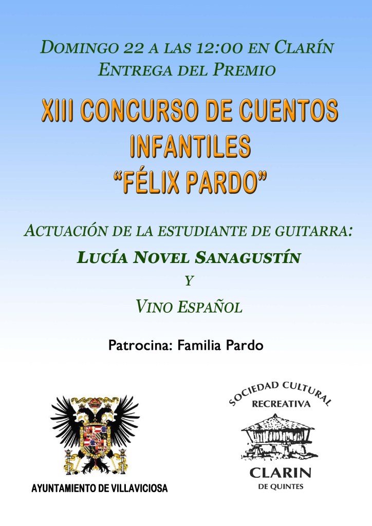 La Sociedad Cultural y Recreativa (SCR) Clarín de Quintes (Villaviciosa-Asturias), convoca la decimoquinta edición del certamen literario de Cuentos Infantiles “Félix Pardo”. El concurso pretende estimular, reconocer y difundir la dedicación, el esfuerzo y el buen hacer de quienes emprenden y asumen, con acierto, la práctica u oficio de escritura.