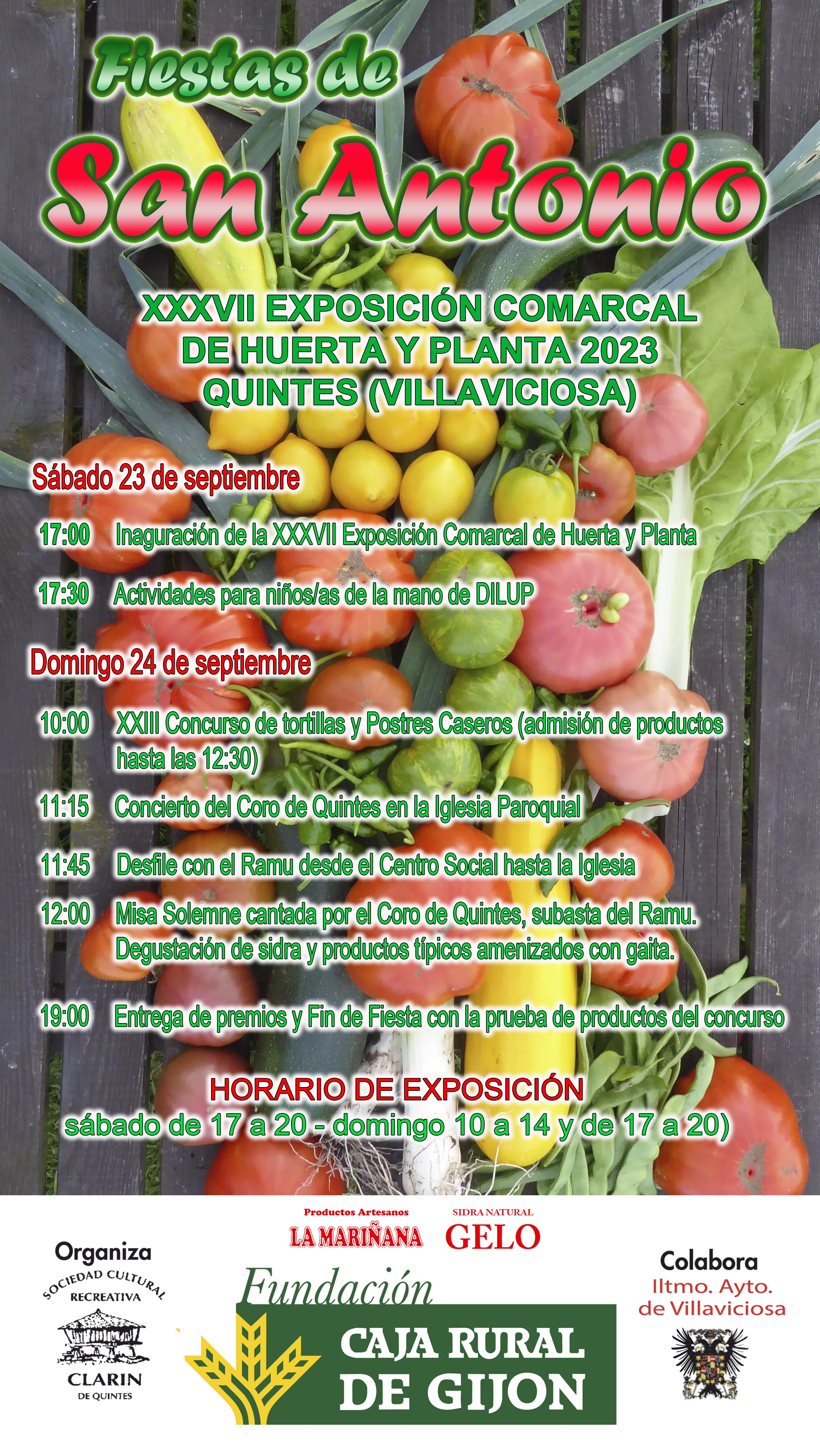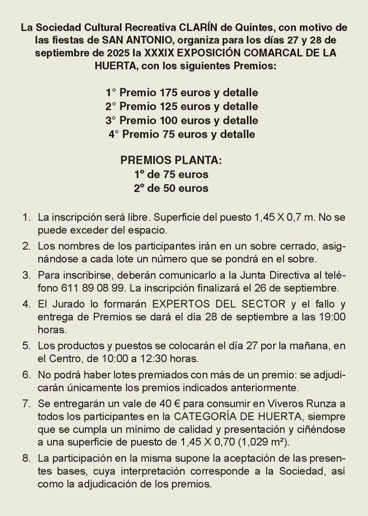 La Sociedad Cultural Recreativa CLARÍN de Quintes, con motivo de las fiestas de SAN ANTONIO, organiza para los días 23 y 24 de septiembre de 2023 la XXXVII EXPOSICIÓN COMARCAL DE LA HUERTA, con los siguientes Premios: