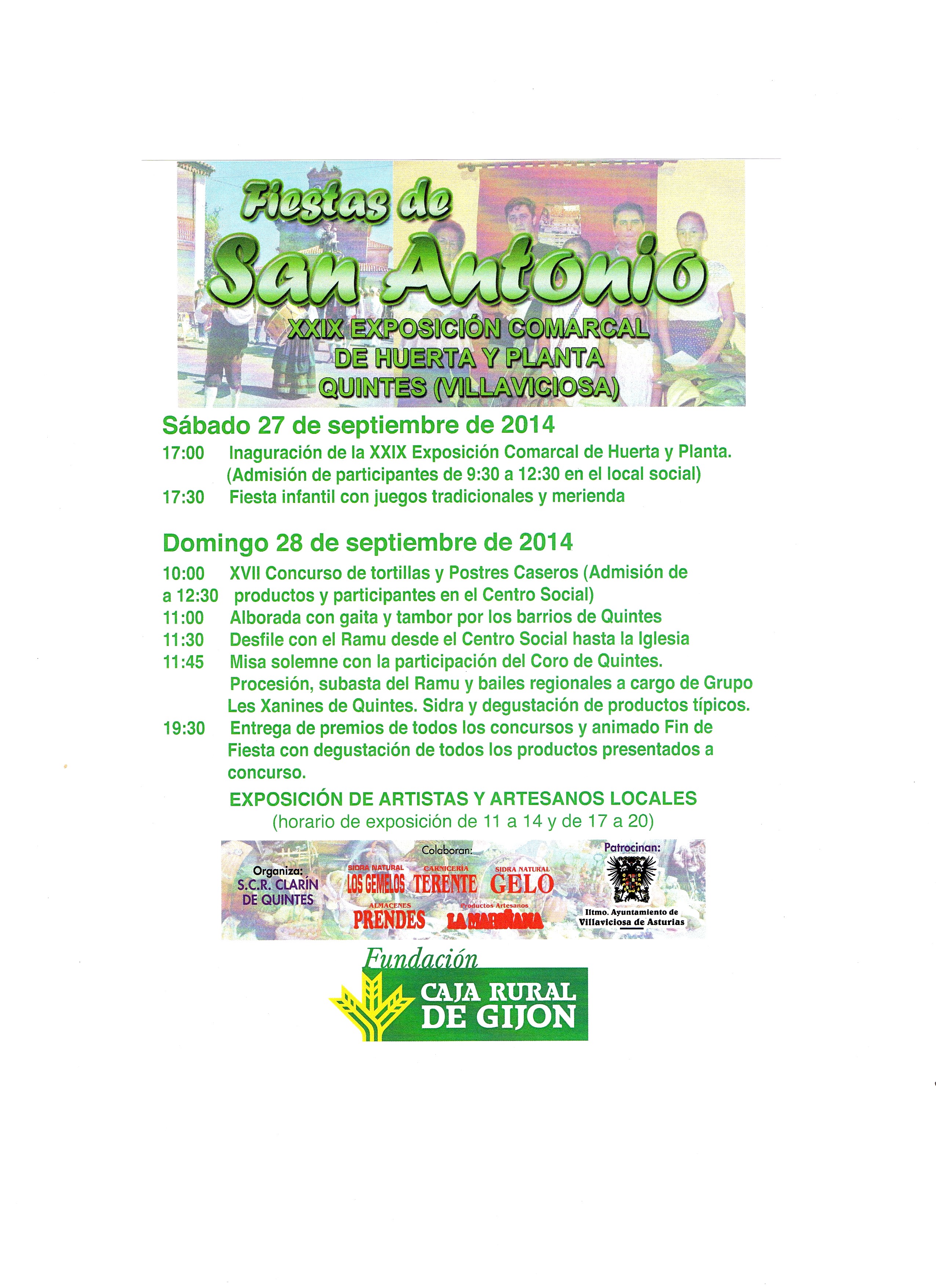 - El domingo 28: por la mañana ye la celebración religiosa y folclórica con procesión por Les Xanines y mozos y xente del pueblu con misa a las 11.45 y luego subasta del ramu y de un jamonín que rifaremos desde la SCR Clarín. Y la prestosa sesión vermú en la calle. Una cita especial, muy nuestra. Tas invitau. Colabora.